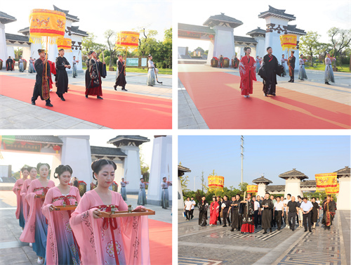 “泗水王劉靖”“婕妃”以諸侯之禮歡迎賓客,儀仗肅立、華蓋蔽日,再現興盛時期“大漢酒國”的榮耀與威儀。基地員工依諸侯禮節表演了六佾文舞,彩帶紛飛、古韻十足,展現了“仁義禮智信”的中華正統文化精髓。